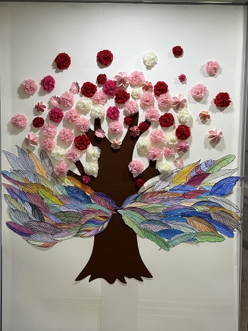 그렇게 완성된 이번 협동화는 ‘함께 피워낸 봄, 희망의 날개’를 주제로 하고 있습니다. 중심에 자리한 나무는 어르신들의 삶과 시간을 상징하며, 그 위에 피어난 꽃들은 각자의 기억과 감정을 담아내고 있습니다. 그리고 양옆으로 펼쳐진 형형색색의 날개는 어르신들의 따뜻한 마음과 서로를 향한 응원이 모여 완성된, 희망과 위로의 상징입니다.
