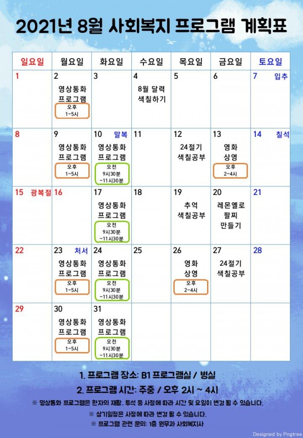 2021년 8월 사회복지 프로그램 계획표 페이지 정보 작성자 최고관리자 작성일21-08-10 13:21 조회9,184회 댓글0건 관련링크 이전글 다음글 본문 2021년 8월 사회복지 프로그램 계획표 입니다. ※배경 참고: pngtree.com 목록