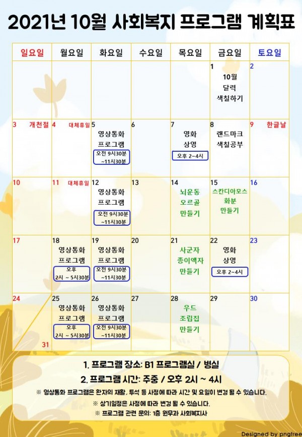 2021년 10월 사회복지 프로그램 계획표 페이지 정보 작성자 최고관리자 작성일21-10-02 17:06 조회9,166회 댓글0건 관련링크 이전글 다음글 본문 2021년 10월 사회복지 프로그램 계획표 입니다. ※배경 참고: pngtree.com 목록