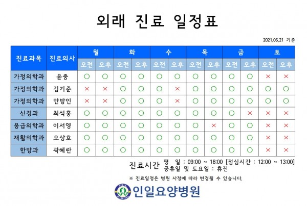 2022년 04월 외래 진료 일정표 페이지 정보 작성자 최고관리자 작성일20-07-27 10:18 조회10,040회 댓글0건 관련링크 이전글 다음글 본문 외래 진료 시 참고하시기 바랍니다. 목록