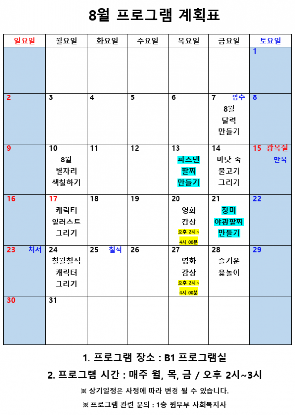 2020년 8월 사회복지 프로그램 계획표 페이지 정보 작성자 최고관리자 작성일20-08-10 16:22 조회9,621회 댓글0건 관련링크 이전글 다음글 본문 2020년 8월 사회복지 프로그램 계획표 입니다.^^ 목록
