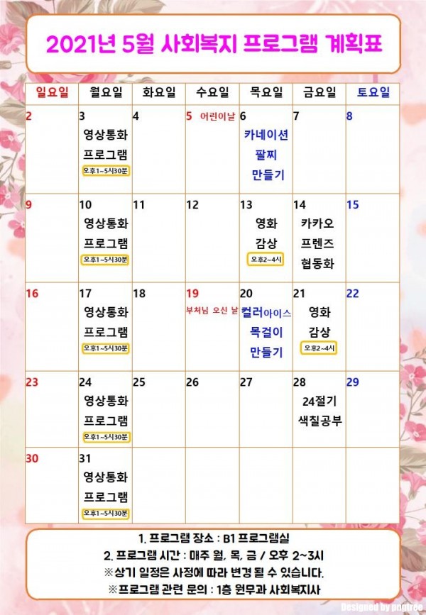 2021년 5월 사회복지 프로그램 계획표 페이지 정보 작성자 최고관리자 작성일21-05-04 09:42 조회9,116회 댓글0건 관련링크 이전글 다음글 본문 2021년 5월 사회복지 프로그램 계획표 입니다. ※배경 참고: pngtree.com 목록