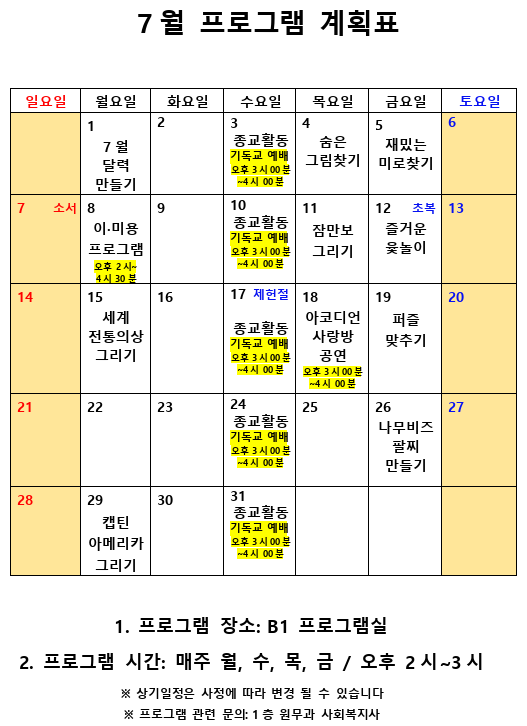 2019년 7월 사회복지 프로그램 계획표 페이지 정보 작성자 최고관리자 작성일19-07-01 10:04 조회9,685회 댓글0건 관련링크 이전글 다음글 본문 2019년 7월 사회복지 프로그램 계획표 입니다.^^ 목록