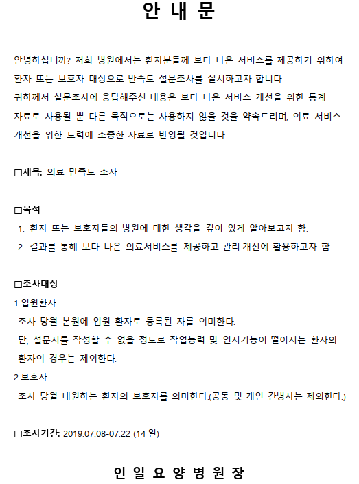 2019년 의료 만족도 조사 안내문 페이지 정보 작성자 최고관리자 작성일19-07-03 16:47 조회11,389회 댓글0건 관련링크 이전글 다음글 본문 2019년 의료 만족도 조사 안내문입니다. 목록