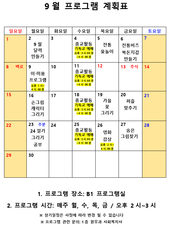 2019년 9월 사회복지 프로그램 계획표 페이지 정보 작성자 최고관리자 작성일19-09-02 09:21 조회9,446회 댓글0건 관련링크 이전글 다음글 본문 2019년 9월 사회복지 프로그램 계획표 입니다.^^ 목록