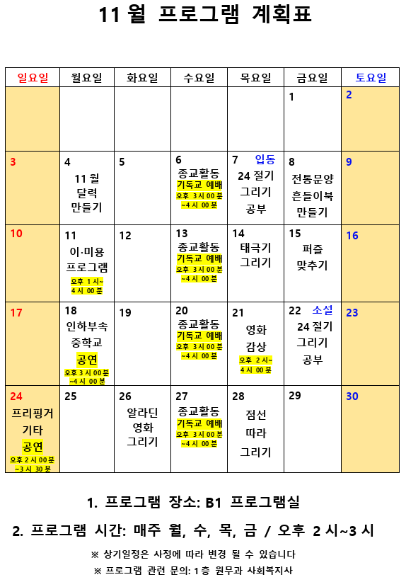 2019년 11월 사회복지 프로그램 계획표 페이지 정보 작성자 최고관리자 작성일19-11-04 09:14 조회9,357회 댓글0건 관련링크 이전글 다음글 본문 2019년 11월 사회복지 프로그램 계획표 입니다.^^ 목록