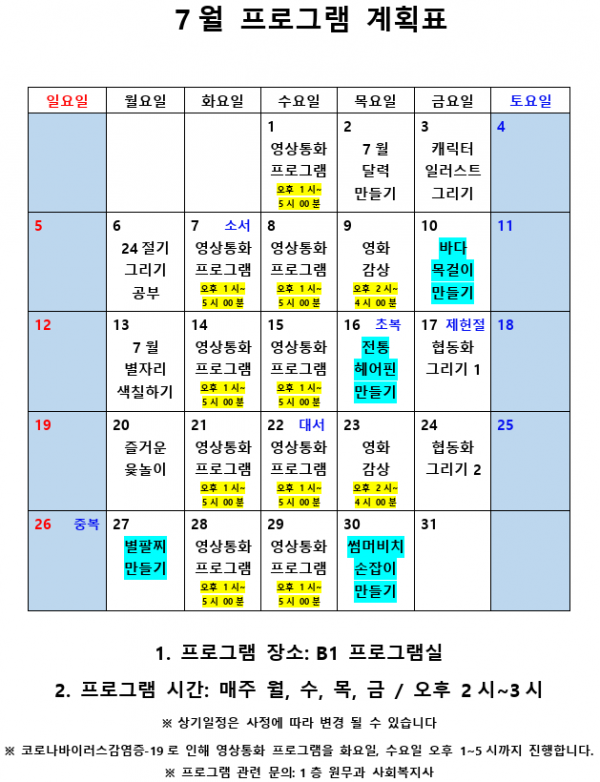 2020년 7월 사회복지 프로그램 계획표 페이지 정보 작성자 최고관리자 작성일20-07-03 16:10 조회9,152회 댓글0건 관련링크 이전글 다음글 본문 2020년 7월 사회복지 프로그램 계획표 입니다.^^ 목록