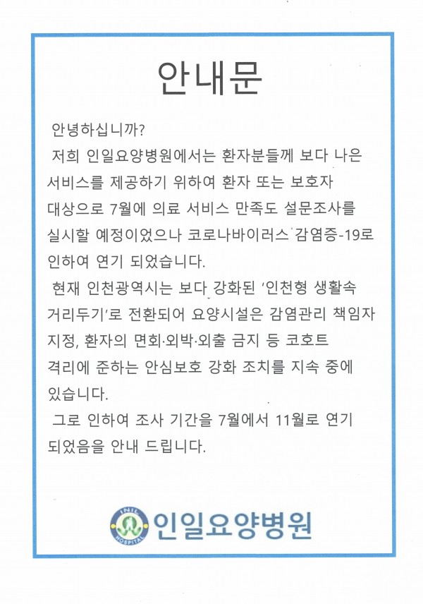 2020년 7월 의료 만족도 조사 연기 안내 페이지 정보 작성자 최고관리자 작성일20-07-27 10:11 조회9,471회 댓글0건 관련링크 이전글 다음글 본문 2020년 7월에 시행 예정이었던 의료 만족도 조사 연기 안내 입니다. 목록