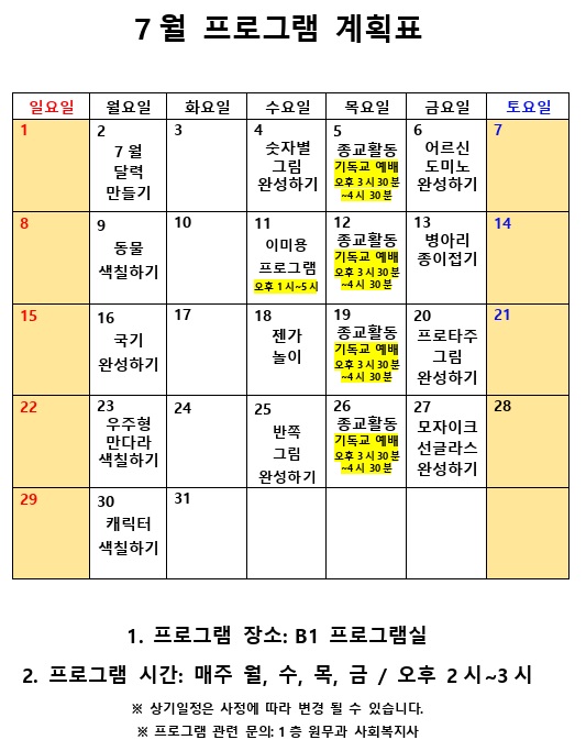 7월 사회복지 프로그램 계획표 페이지 정보 작성자 최고관리자 작성일18-07-03 15:51 조회9,733회 댓글0건 관련링크 이전글 다음글 본문 7월 사회복지 프로그램 계획표 목록