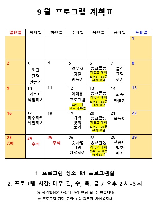 9월 사회복지 프로그램 계획표 페이지 정보 작성자 최고관리자 작성일18-09-04 09:12 조회9,838회 댓글0건 관련링크 이전글 다음글 본문 9월 사회복지 프로그램 계획표 목록