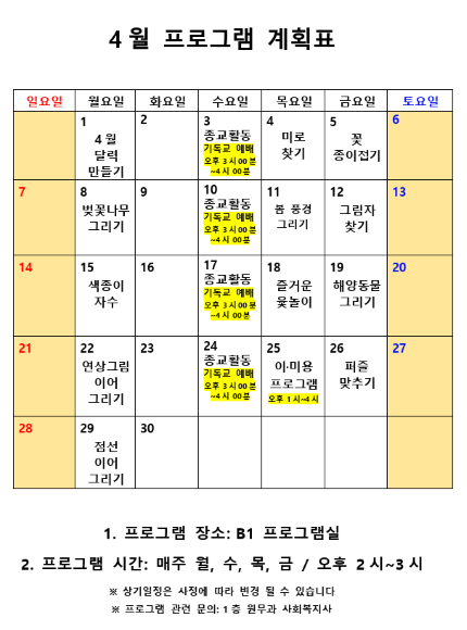 2019년 4월 사회복지 프로그램 계획표 페이지 정보 작성자 최고관리자 작성일19-04-01 10:32 조회9,778회 댓글0건 관련링크 이전글 다음글 본문 2019년 4월 사회복지 프로그램 계획표 입니다.^^ 목록