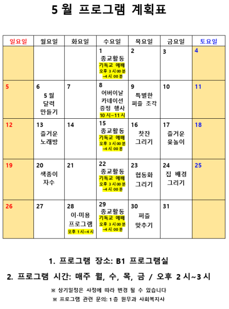 2019년 5월 사회복지 프로그램 계획표 페이지 정보 작성자 최고관리자 작성일19-05-17 16:25 조회9,406회 댓글0건 관련링크 이전글 다음글 본문 2019년 5월달 사회복지 프로그램 계획표(수정) 입니다.^^ 목록