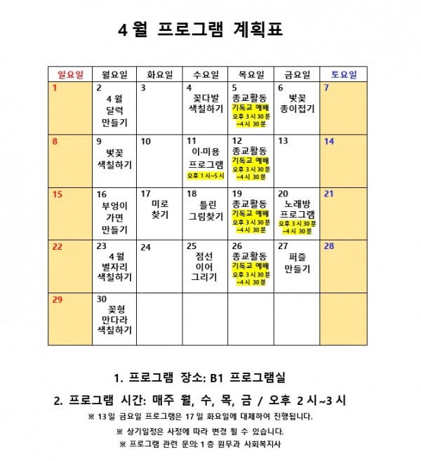 4월 사회복지 프로그램 계획표 페이지 정보 작성자 최고관리자 작성일18-04-05 13:35 조회9,499회 댓글0건 관련링크 이전글 다음글 본문 4월 사회복지 프로그램 계획표 목록