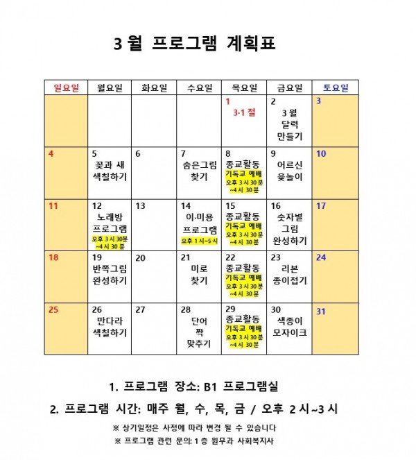 3월 사회복지 프로그램 계획표 페이지 정보 작성자 최고관리자 작성일18-04-05 13:30 조회9,769회 댓글0건 관련링크 이전글 다음글 본문 3월 사회복지 프로그램 계획표 목록