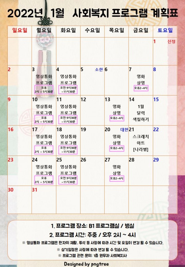 2022년 1월 사회복지 프로그램 계획표 페이지 정보 작성자 최고관리자 작성일22-01-14 11:32 조회9,350회 댓글0건 관련링크 이전글 다음글 본문 2022년 1월 사회복지 프로그램 계획표 입니다. ※배경 참고: pngtree.com 목록