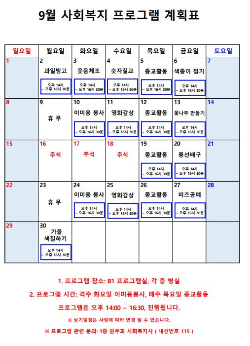 2024년 9월 프로그램 계획서 페이지 정보 작성자 최고관리자 작성일24-09-06 11:21 조회4,575회 댓글0건 관련링크 이전글 다음글 본문 2024년 9월 프로그램 계획서입니다. 감사합니다. 목록
