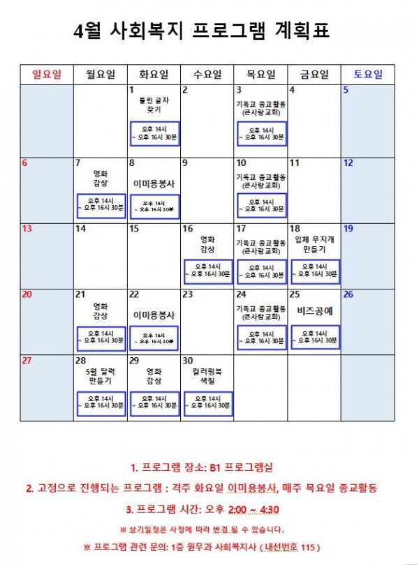 2025년 4월 프로그램 계획표 페이지 정보 작성자 최고관리자 작성일25-04-04 14:32 조회2,136회 댓글0건 관련링크 이전글 다음글 본문 2025년 4월 프로그램 계획표입니다. 감사합니다. 목록