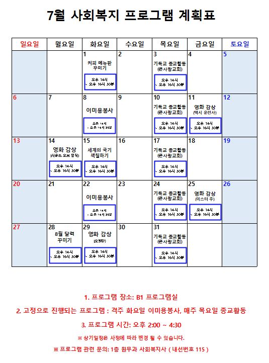2025년 7월 프로그램 계획표 페이지 정보 작성자 최고관리자 작성일25-07-01 09:45 조회1,935회 댓글0건 관련링크 이전글 다음글 본문 2025년 7월 프로그램 계획표입니다. 감사합니다. 목록