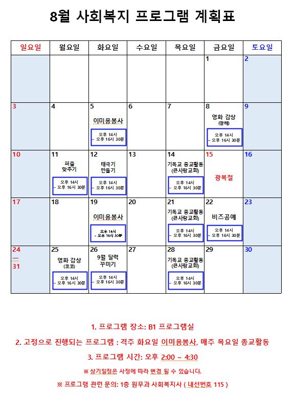 2025년 8월 프로그램 계획표 페이지 정보 작성자 최고관리자 작성일25-08-01 09:54 조회1,766회 댓글0건 관련링크 이전글 다음글 본문 2025년 8월 프로그램 계획표입니다. 감사합니다. 목록